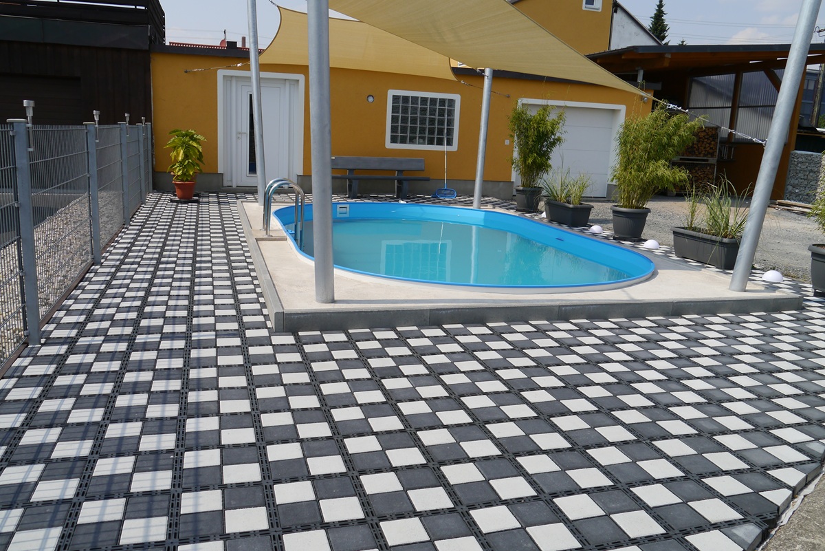 Proč u bazénu vynechat klasický štěrk nebo trávu? Sypaný štěrk představuje riziko protržení bazénové fólie a píchá do bosých nohou, zatímco mokrá tráva se lepí na chodidla a zbytečně znečišťuje vodu v bazénu.